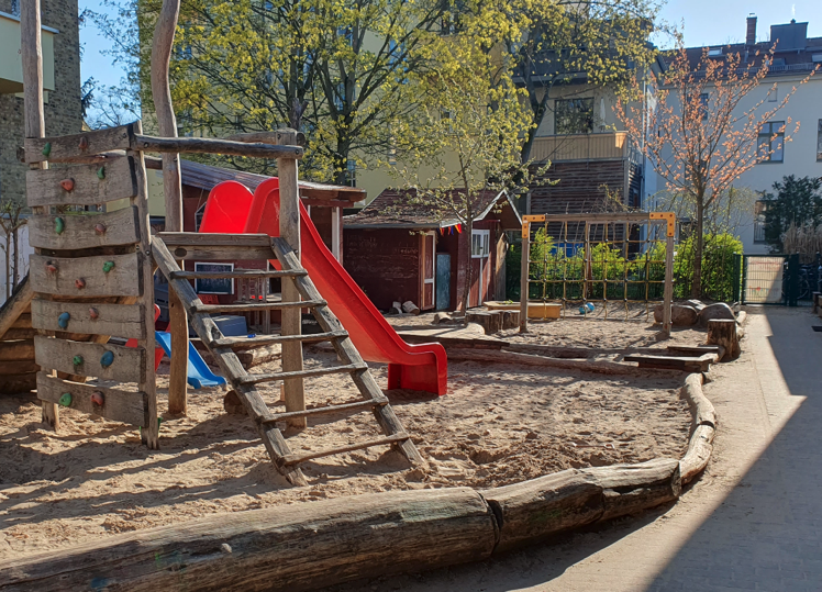 Der kleine Garten der Kita ist abwechslungsreich und mit Bedacht nach pädagogischen Gesichtspunkten gestaltet und ist im Frühjahr eine wahre Augenweide! 🌷 🙂 Viele Winkel, "geheime Ecken" und Gänge erlauben es den Kindern, sich zurückzuziehen und ihren eigenen "Lieblingsort" zu finden, ohne dass die Erzieher:innen insgesamt den Überblick verlieren. Eine große Sandfläche lädt zum buddeln (und im Sommer zum Plantschen) ein, es gibt Fußballtore und einen Holzturm mit Leitern, Kletterwand und Rutsche. Die in der Garten-AG engagierten Eltern kümmern sich um Pflege und neue Bepflanzung des Gartens und die Reparatur und Neuanschaffung von Spieleinrichtungen.